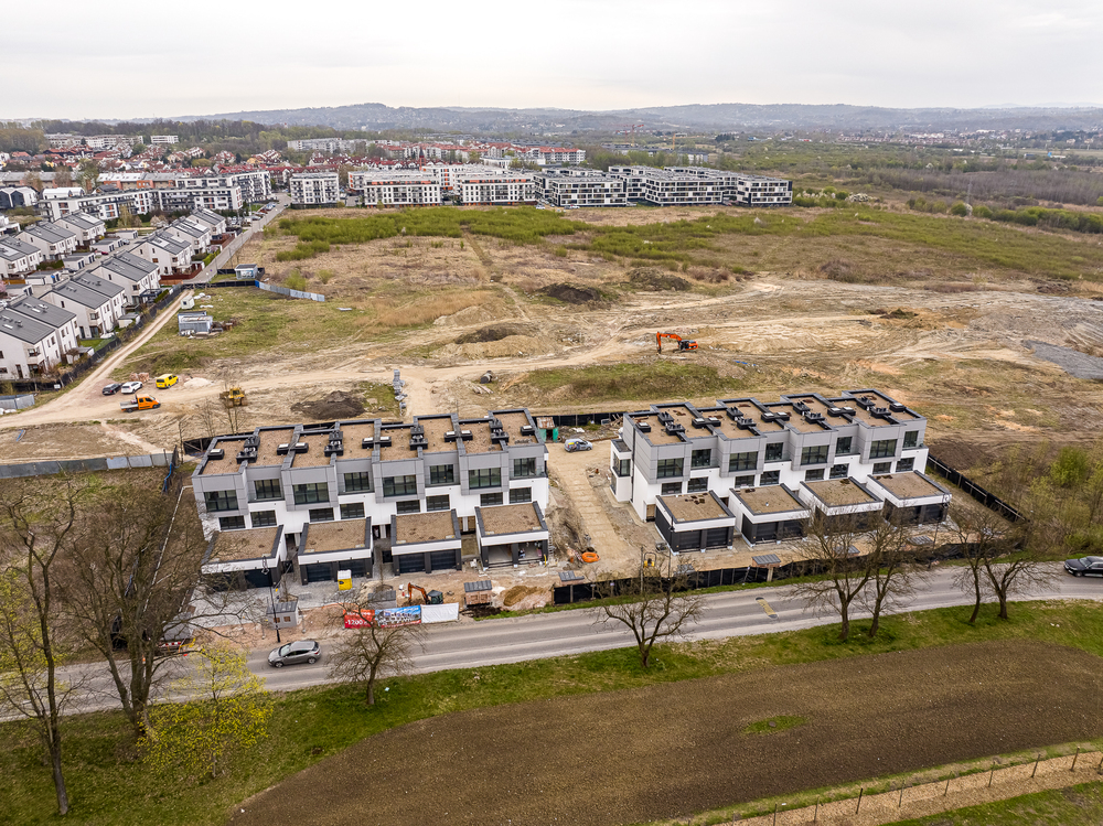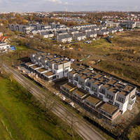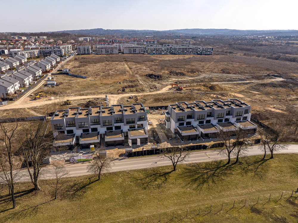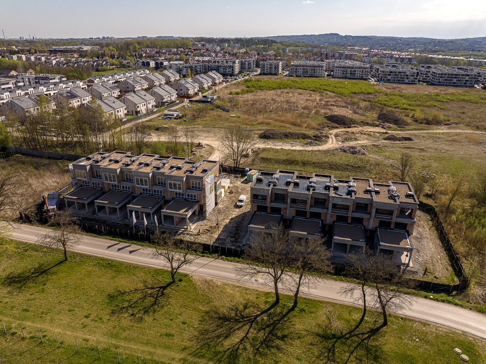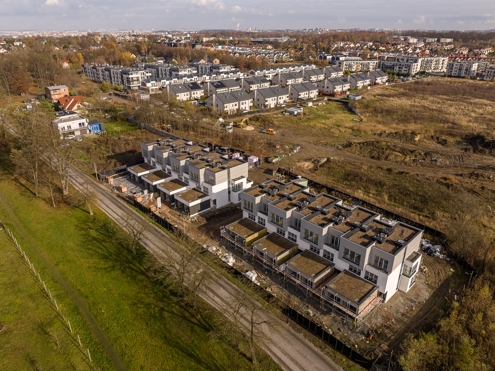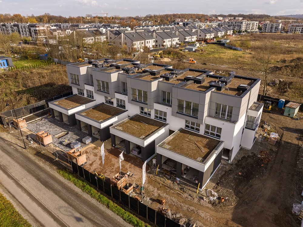 Domy w zabudowie szeregowej przy ulicy Spacerowej w Krakowie.